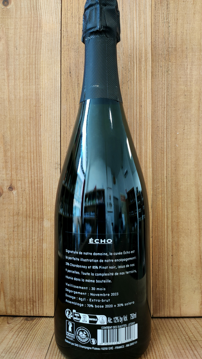 La cuvée Echo, c'est la base chez Fluteau : grosse majorité de Pinot Noir pour un champagne qui va patienter quatre ans avant dégorgement (ce que cherchent les puristes...). On obtient un champagne sur le fruit par le Pinot Noir, bien équilibré par la minéralité crémeuse du Chardonnay. Les arômes de poire et de pêche blanche, bien gourmands, en font un excellent champagne d'apéritif ou de dessert !