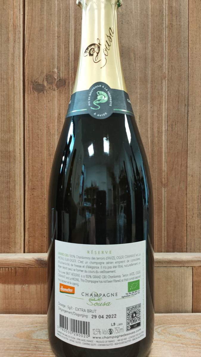 Nous sommes à Avize, dans le sud de la Champagne, où se trouve la Côtedes Grands Crus, essentiellement plantés de Chardonnay : les Blancs deBlancs sont particulièrement recherchés par un public de connaisseurs qui apprécient la délicatesse de leurs arômes, leur fraîcheur et leur vivacité. La cuvée Réserve est vinifiée en cuves pour respecter les arômes du chardonnay et des terroirs. Erick De Sousa a ainsi voulu conserver l'authenticité des vignes (non chaptalisées) pour conserver la finesse du vin : ses enfants Charlotte, Valentin et Julie poursuivent le travail dans le même esprit : tout en bio et en biodynamie, il n’y a même plus de tracteur, c’est avec des chevaux que les sols sont labourés…